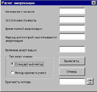 Для решения задачи нахождения вычисления амортизации оборудования по стандартному методу или методу к-кратного учета с помощью редактора пользовательских форм создадим диалоговое окно Расчет амортизации (рис. У4.1).